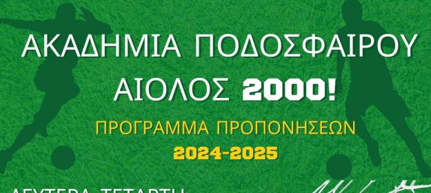 Άρχισαν οι εγγραφές της νέας σεζόν στην Ακαδημία ποδοσφαίρου ”ΑΙΟΛΟΣ 2000” στις εγκαταστάσεις της Ακαδημίας στα Λέπουρα Ευβοίας. Ξεκίνημα της νέας χρονιάς η 11η Σεπτεμβρίου.